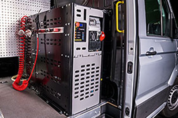 Selbst die Werkbank fährt immer mit: Diese lässt sich am Einsatzort mit nur wenigen Handgriffen ausziehen und beansprucht im Fahrzeug selbst kaum Platz. Für zusätzliche Sicherheit beim Transport können an der Ladungssicherungsschiene einklippbare Spanngurte angebracht werden.